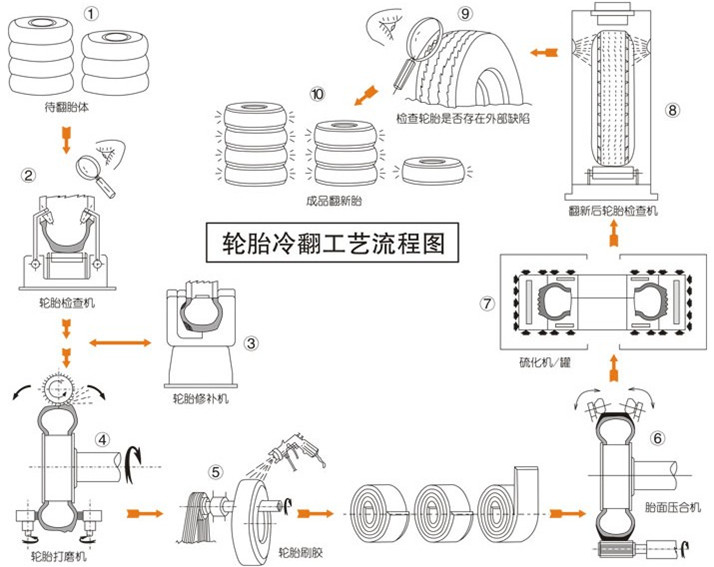 6、把輪胎放進硫化罐通過高溫硫化使輪胎重新堅韌、結實耐用?! ?br />7、輪胎翻新工藝過程中的_后一個步驟是_終檢驗。以_翻新后的輪胎能重新使用,從而實現廢舊輪胎再利用。